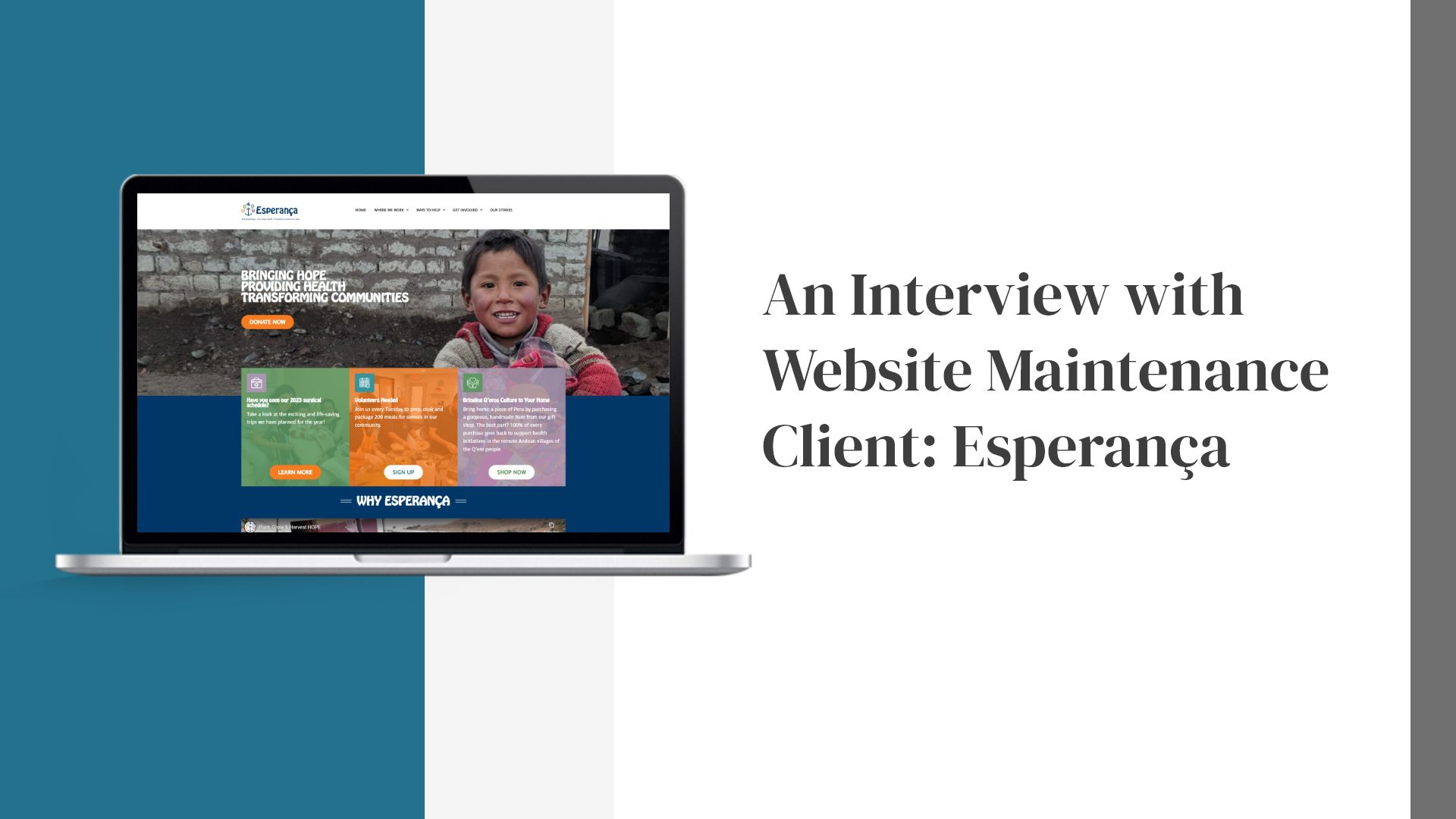 Hammersmith Support was honored to redesign the Esperança website over a year ago, and the organization has been a maintenance client ever since. We are grateful for Esperança’s marketing manager, Elena Burr, who shared her experience as a maintenance client.